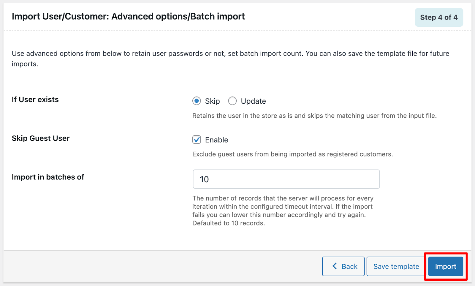 - Skip guest users: If your CSV includes guest user records that you don’t want to import as registered users, enable this option to exclude them from the import.