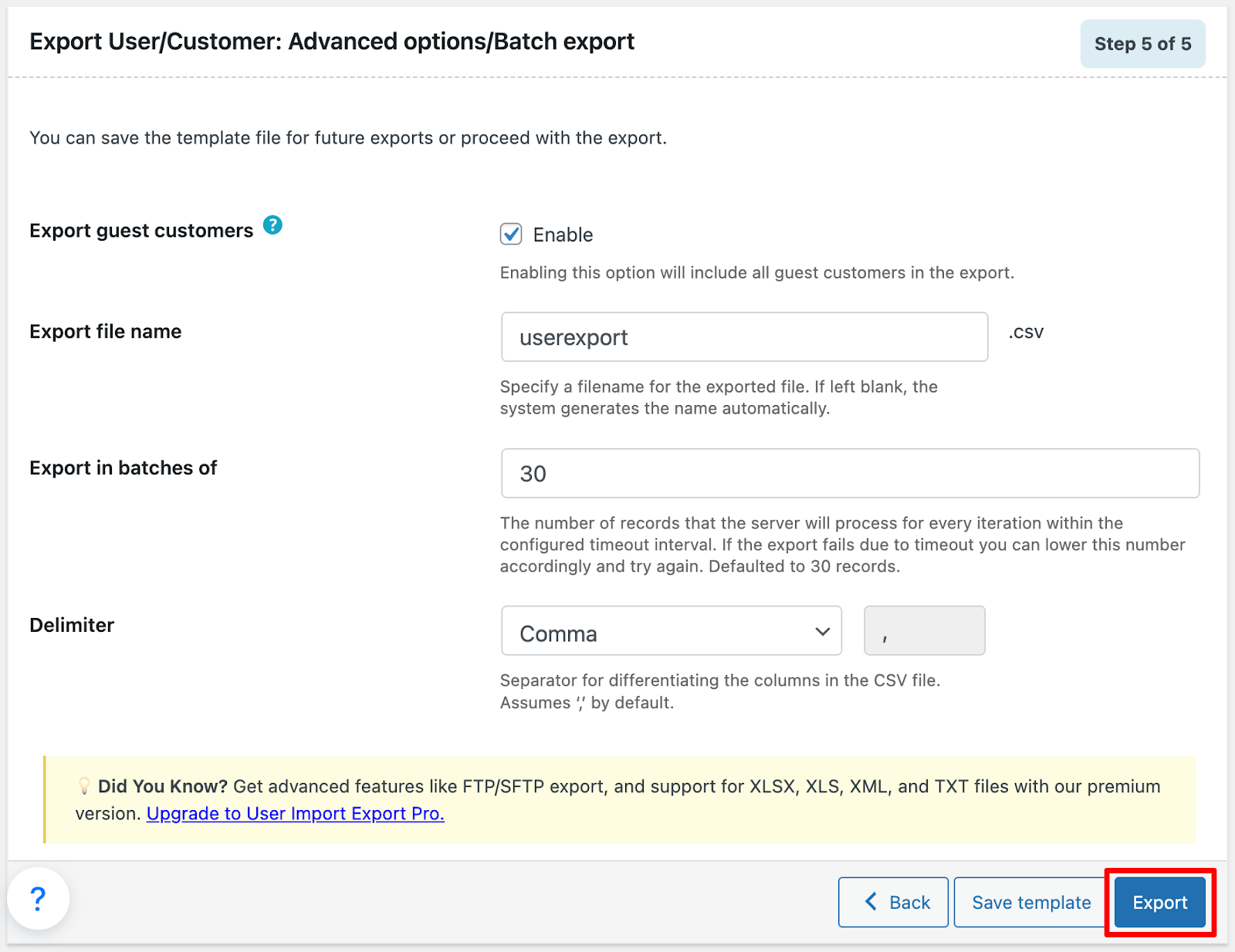 - Include guest users: Enable this option if you want guest customers to be included in the export.